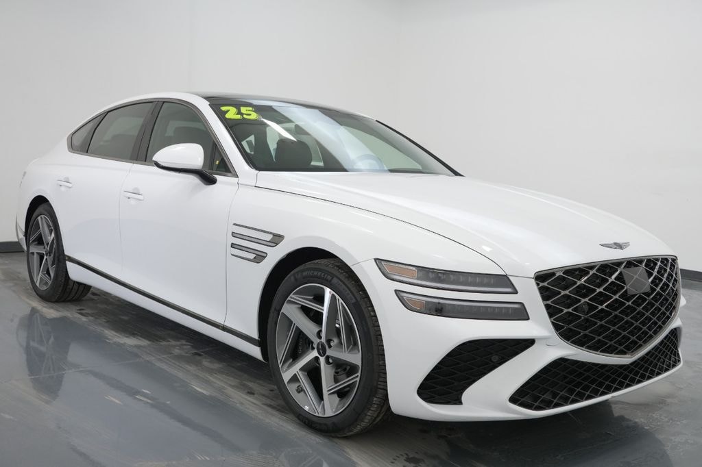 Alta White 2025 Genesis G80 3.5T AWD 8-Speed Automatic 3.5L V6 PDI Turbocharged DOHC 24V LEV3-ULEV50 375hp ** Backup Camera, ** Bluetooth, Hands Free, ** Cruise Control, ** Keyless Entry, ** Premium Sound System / Premium Audio, ** Stability Control, ** Steering Wheel Controls, ** USB Port.