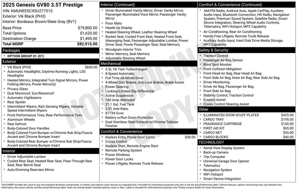 Vik Black 2025 Genesis GV80 3.5T Prestige AWD 8-Speed Automatic 3.5L DOHC ** Backup Camera, ** Bluetooth, Hands Free, ** Cruise Control, ** Keyless Entry, ** Premium Sound System / Premium Audio, ** Stability Control, ** Steering Wheel Controls, ** USB Port.
