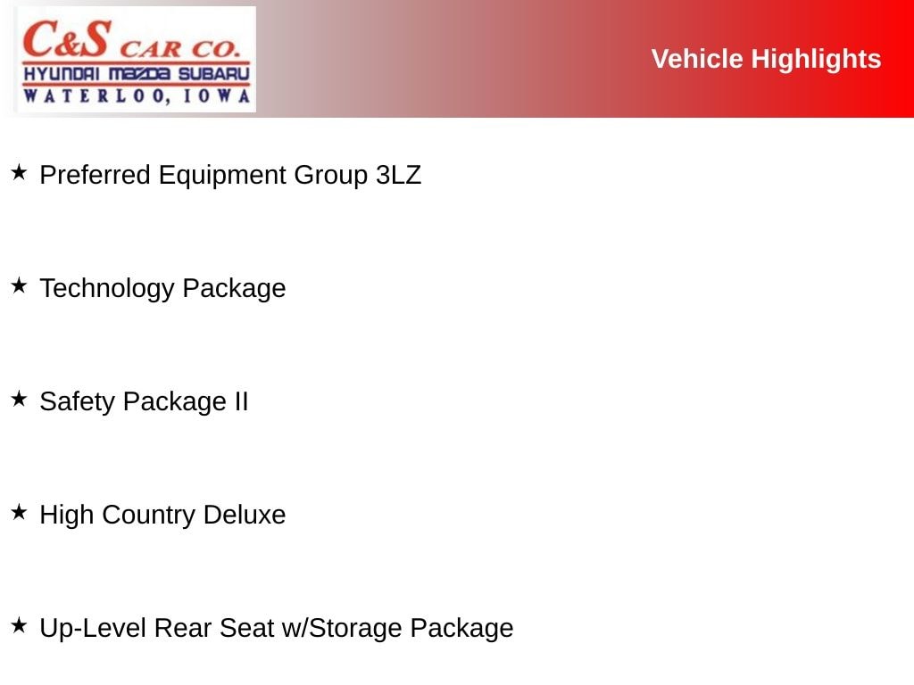 10-Way Power Driver Seat w/Lumbar, 10-Way Power Passenger Seat Adjuster w/Lumbar, 12-Volt Rear Auxiliary Power Outlet, 120-Volt Bed Mounted Power Outlet, 120-Volt Instrument Panel Power Outlet, 15" Diagonal Multicolor Head-Up Display, 2nd Row Heated Outboard Seats, 4G LTE Wi-Fi Hot Spot Capable, 8" Driver Information Center, Adaptive Cruise Control - Camera, Advanced Trailering System, All-Weather Floor Liner (LPO), Auto-Dimming Inside Rear-View Mirror, Automatic Emergency Braking, Auxiliary External Transmission Oil Cooler, Bed View Camera, Bluetooth® For Phone, Chevrolet Connected Access Capable, Chevytec Spray-On Black Bedliner, Chrome Assist Steps, Chrome Grille, Chrome Recovery Hooks, Color-Keyed Carpeting Floor Covering, Compass, Deep-Tinted Glass, Driver Memory, Dual Exhaust w/Polished Outlets, Electric Rear-Window Defogger, Electrical Lock Control Steering Column, Floor Mounted Center Console, Following Distance Indicator, Forward Collision Alert, Front Carpeted Floor Mats, Front LED Fog Lamps, Front Pedestrian Braking, HD Radio, HD Rear Vision Camera, HD Surround Vision w/2 Trailer View Camera Provisions, Heated Driver & Front Outboard Passenger Seats, Heated Steering Wheel, Heavy-Duty Rear Locking Differential, High Country Deluxe, Hitch Guidance, Hitch Guidance w/Hitch View, Integrated Trailer Brake Controller, IntelliBeam Automatic High Beam On/Off, Keyless Open & Start, Lane Change Alert w/Side Blind Zone Alert, Lane Keep Assist w/Lane Departure Warning, Leather Wrapped Steering Wheel, LED Cargo Area Lighting, Manual Tilt/Telescoping Steering Column, OnStar & Chevrolet Connected Services Capable, Outside Heated Power-Adjustable Mirrors, Painted Mirror Caps, Power Door Locks, Power Front Passenger Windows w/Express Up/Down, Power Front Windows w/Driver Express Up/Down, Power Rear Windows w/Express Down, Power Sliding Rear Window w/Rear Defogger, Power Sunroof, Preferred Equipment Group 3LZ, Rear Camera Mirror, Rear Carpeted Floor Mats, Rear Cross Traffic Alert, Rear Dual USB Charging-Only Ports, Rear Wheelhouse Liners, Remote Vehicle Starter System, Safety Alert Seat, Safety Package II, SiriusXM w/360L, Steering Wheel Audio Controls, Steering Wheel Mounted Electronic Cruise Control, Technology Package, Theft Deterrent System (Unauthorized Entry), Trailering Package, Ultrasonic Front & Rear Park Assist, Universal Home Remote, Up-Level Rear Seat w/Storage Package, Ventilated Driver & Front Passenger Seats, Wireless Charging.