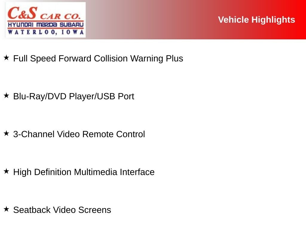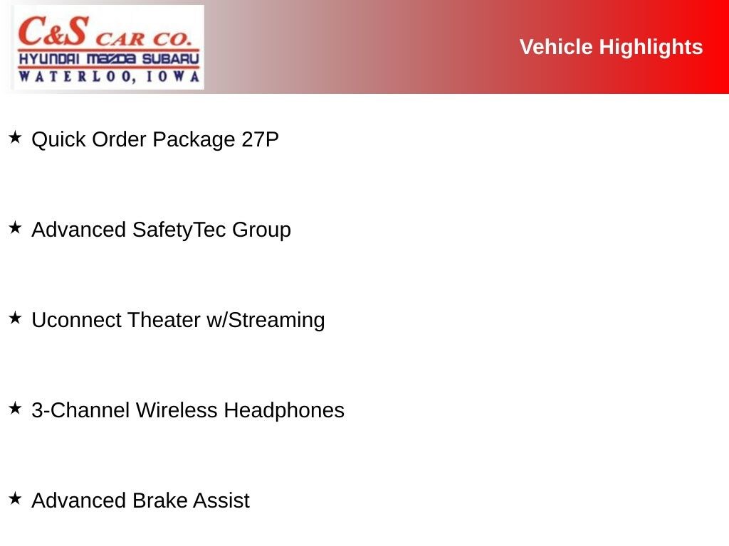 115V Auxiliary Power Outlet, 220 Amp Alternator, 3-Channel Video Remote Control, 3-Channel Wireless Headphones, 360 Surround View Camera System, Adaptive Cruise Control w/Stop & Go, Advanced Brake Assist, Advanced SafetyTec Group, Automatic High Beam Headlamp Control, Blu-Ray/DVD Player/USB Port, Full Speed Forward Collision Warning Plus, High Definition Multimedia Interface, Lane Departure Warning Plus, Parallel & Perp Park Assist w/Stop, ParkSense Front/Rear Park Assist w/Stop, Quick Order Package 27P, Rain Sensitive Windshield Wipers, Seatback Video Screens, Uconnect Theater w/Streaming, Video USB Port.