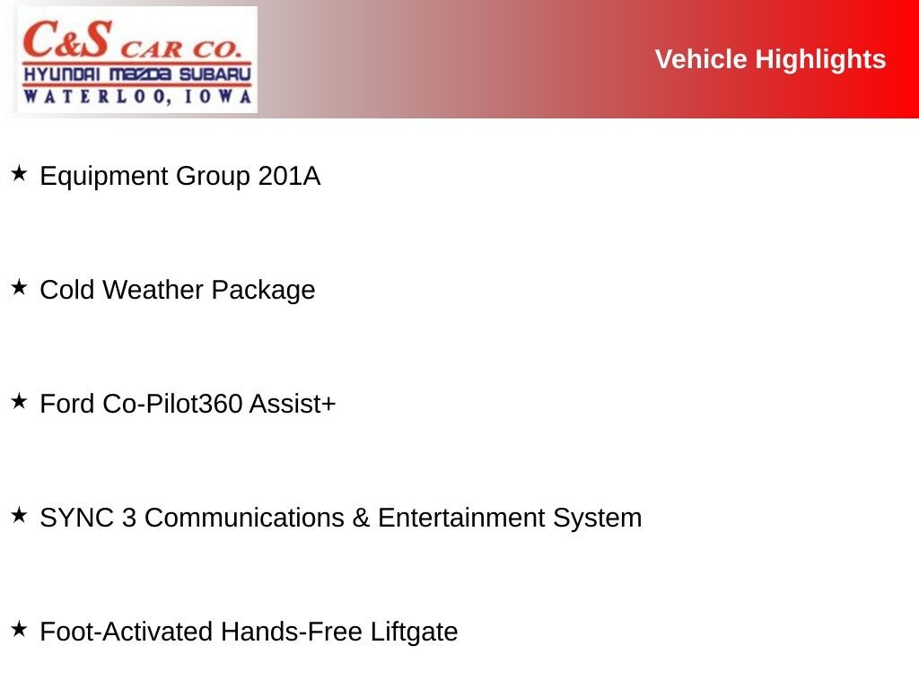- Ford Co-Pilot360 Assist+: Featuring Evasive Steering Assist, Voice-Activated Touchscreen Navigation, SiriusXM Traffic & Travel Link, and Adaptive Cruise Control with Stop & Go and Lane Centering for a safer, more convenient journey.