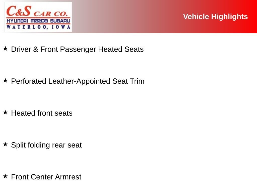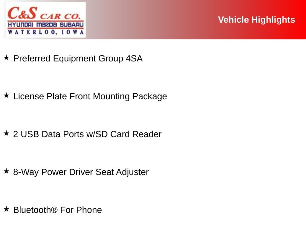 2 USB Data Ports w/SD Card Reader, 4-Way Manual Front Passenger Seat, 8-Way Power Driver Seat Adjuster, Alloy wheels, Bluetooth® For Phone, Driver & Front Passenger Heated Seats, Front Bucket Seats, Front Center Armrest, Heated front seats, License Plate Front Mounting Package, Perforated Leather-Appointed Seat Trim, Power Driver Lumbar Control, Power driver seat, Power steering, Preferred Equipment Group 4SA, Split folding rear seat, Wheels: 18" x 7" Machined Aluminum w/Gray Accents.