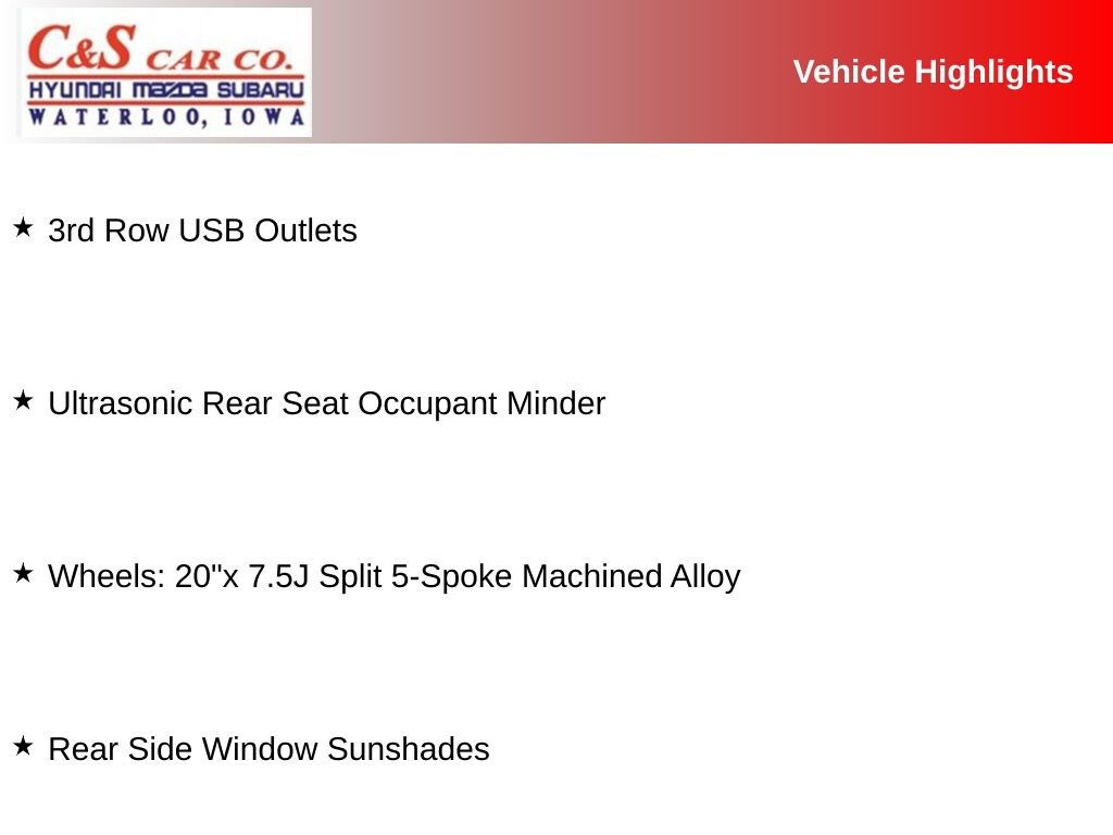 115-Volt AC Power Outlet, 3rd Row USB Outlets, 7" High Resolution Cluster Display, Auto Leveling Rear Suspension, Convenience Package, Convenience Package P2, Hands-Free Smart Liftgate w/Auto Open, LED Taillights, Parking Distance Warning - Forward, Power Sunroof P5, Rear Side Window Sunshades, Ultrasonic Rear Seat Occupant Minder, Wheels: 20"x 7.5J Split 5-Spoke Machined Alloy, Wireless Phone Charger.