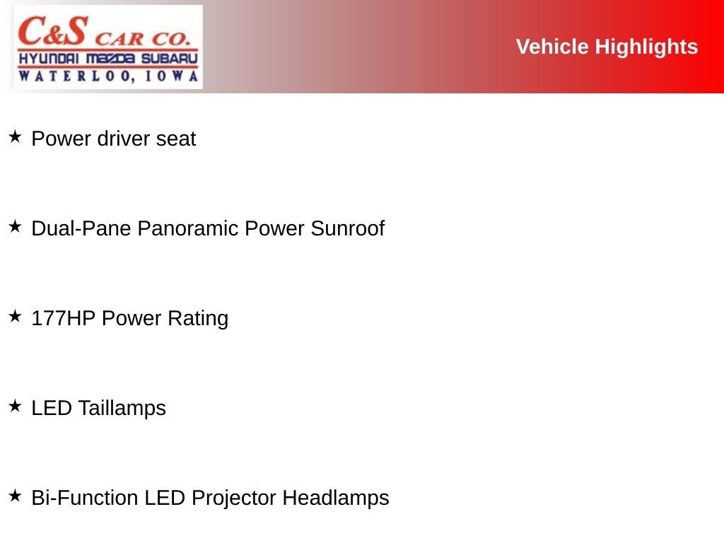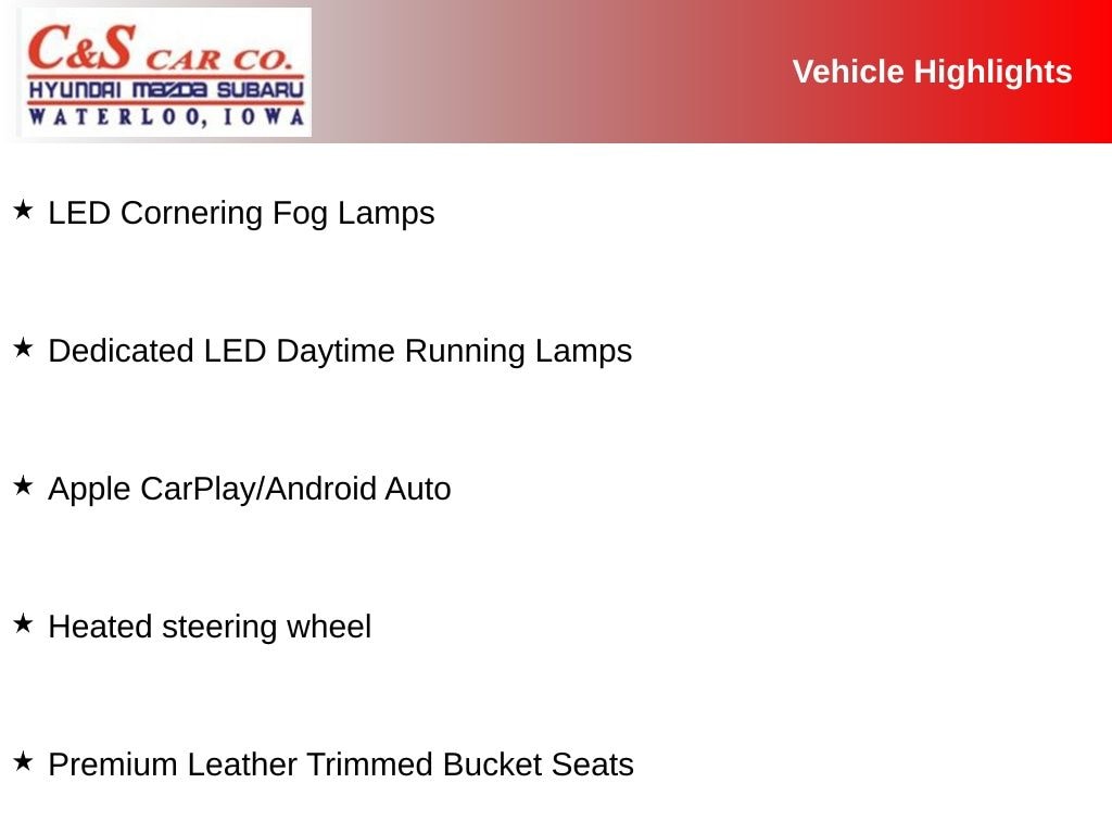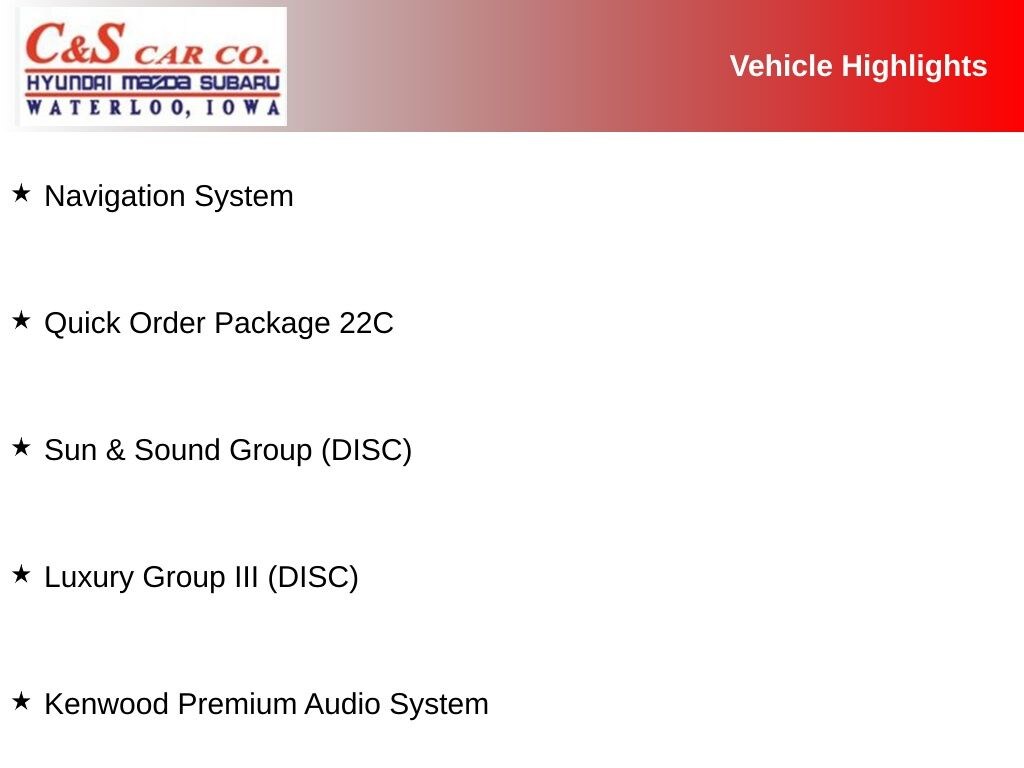 17" x 6.5" Aluminum Wheels, 177HP Power Rating, Apple CarPlay/Android Auto, Bi-Function LED Projector Headlamps, Dedicated LED Daytime Running Lamps, Dual-Pane Panoramic Power Sunroof, Front Seat Back Map Pockets, Heated steering wheel, Kenwood Premium Audio System, LED Cornering Fog Lamps, LED Taillamps, Luxury Group III (DISC), Navigation System, Power driver seat, Premium Leather Trimmed Bucket Seats, Quick Order Package 22C, Sun & Sound Group (DISC).