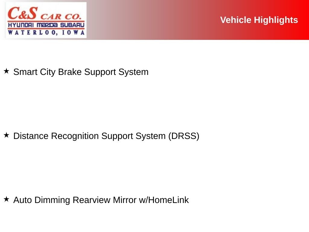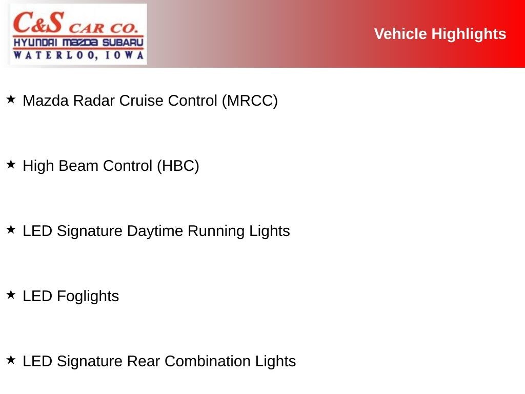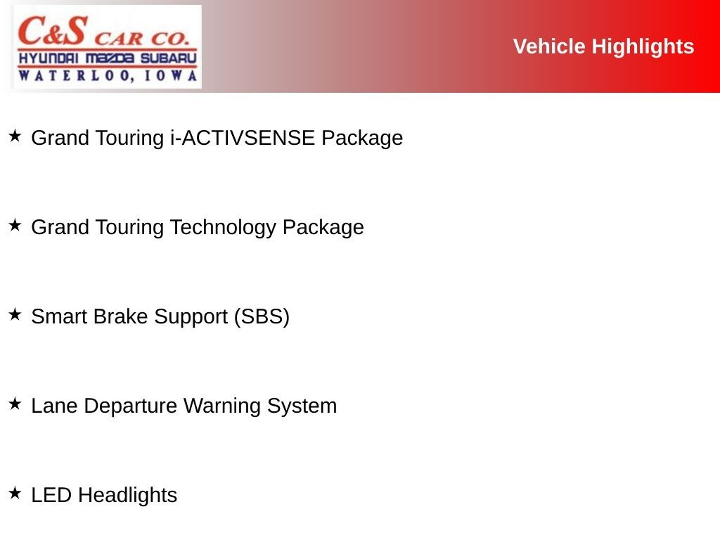 - Grand Touring i-ACTIVSENSE Package: Includes High Beam Control (HBC), Mazda Radar Cruise Control (MRCC), Smart Brake Support (SBS), Lane Departure Warning, Distance Recognition Support System (DRSS)