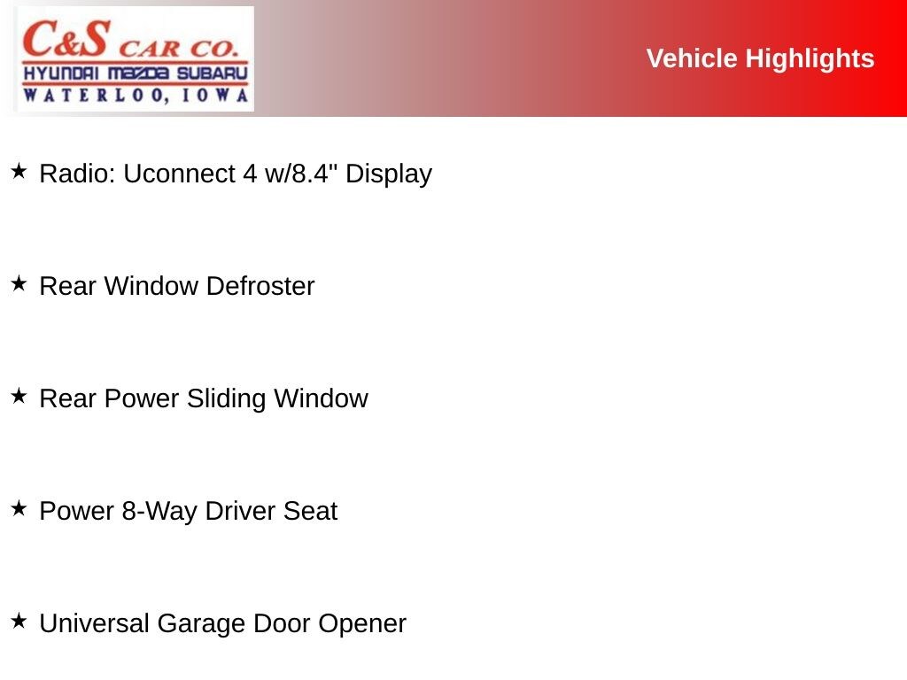 48V Belt Starter Generator, Auto-Dimming Rear-View Mirror, Big Horn IP Badge, Big Horn Level 1 Equipment Group, Class IV Receiver Hitch, Cluster 3.5" TFT Color Display, E-Locker Rear Axle, Foam Bottle Insert (Door Trim Panel), Front Extra HD Shock Absorbers, Glove Box Lamp, Hill Descent Control, Off Road Decals, Off Road Group, Power 4-Way Driver Lumbar Adjust, Power 8-Way Driver Seat, Power Adjustable Pedals, Power Heated Fold Away Mirrors, Quick Order Package 23Z Big Horn/Lone Star, Radio: Uconnect 4 w/8.4" Display, Rear Dome w/On/Off Switch Lamp, Rear Extra HD Shock Absorbers, Rear Power Sliding Window, Rear Window Defroster, Single Disc Remote CD Player, SiriusXM Satellite Radio, Steering Wheel Mounted Audio Controls, Sun Visors w/Illuminated Vanity Mirrors, Tow Hooks, Universal Garage Door Opener, Wheels: 18" x 8".