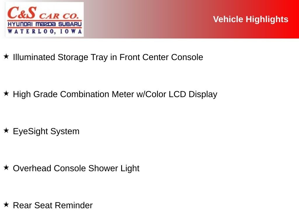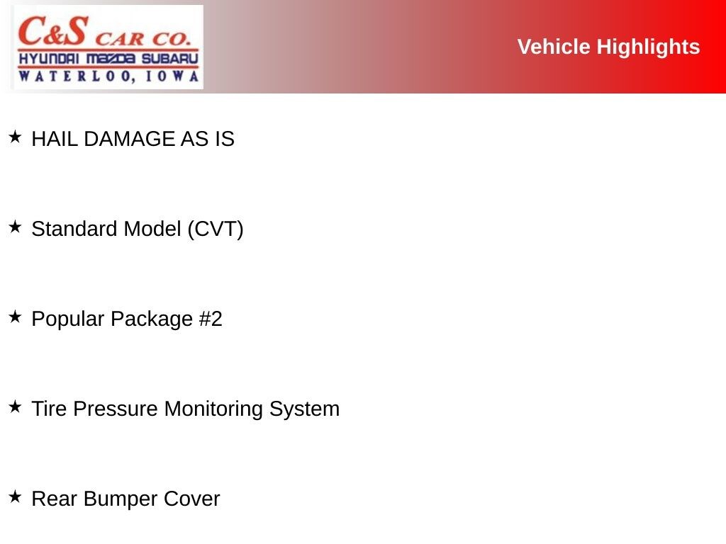 HAIL DAMAGE AS IS, All-Weather Floor Liners, Auto-Dimming Mirror w/Compass & HomeLink, EyeSight System, High Grade Combination Meter w/Color LCD Display, Illuminated Storage Tray in Front Center Console, Leather-Wrapped Shift Lever Handle, Overhead Console Shower Light, Popular Package #2, Rear Bumper Cover, Rear Seat Reminder, Rear Seatback Protector, Splash Guards, Standard Model (CVT), Tire Pressure Monitoring System.
