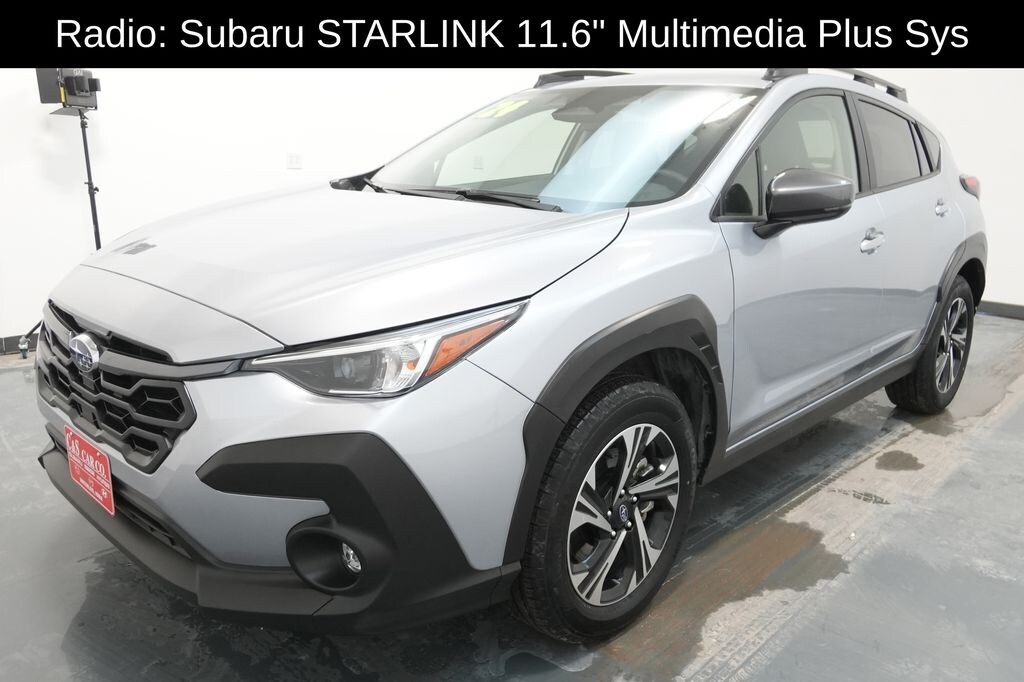 The Crosstrek Premium's exterior shines in a sleek Silver color, complemented by a sporty rear spoiler and LED headlights that provide superior illumination. Step inside and you'll be greeted by premium cloth upholstery, a 11.6-inch STARLINK multimedia system with Apple CarPlay and Android Auto, and a host of advanced safety features like Rear Automatic Braking and Blind-Spot Detection.