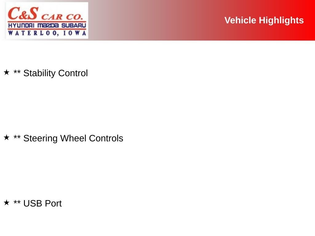 ** Backup Camera, ** Bluetooth, Hands Free, ** Cruise Control, ** Keyless Entry, ** Premium Sound System / Premium Audio, ** Stability Control, ** Steering Wheel Controls, ** USB Port.